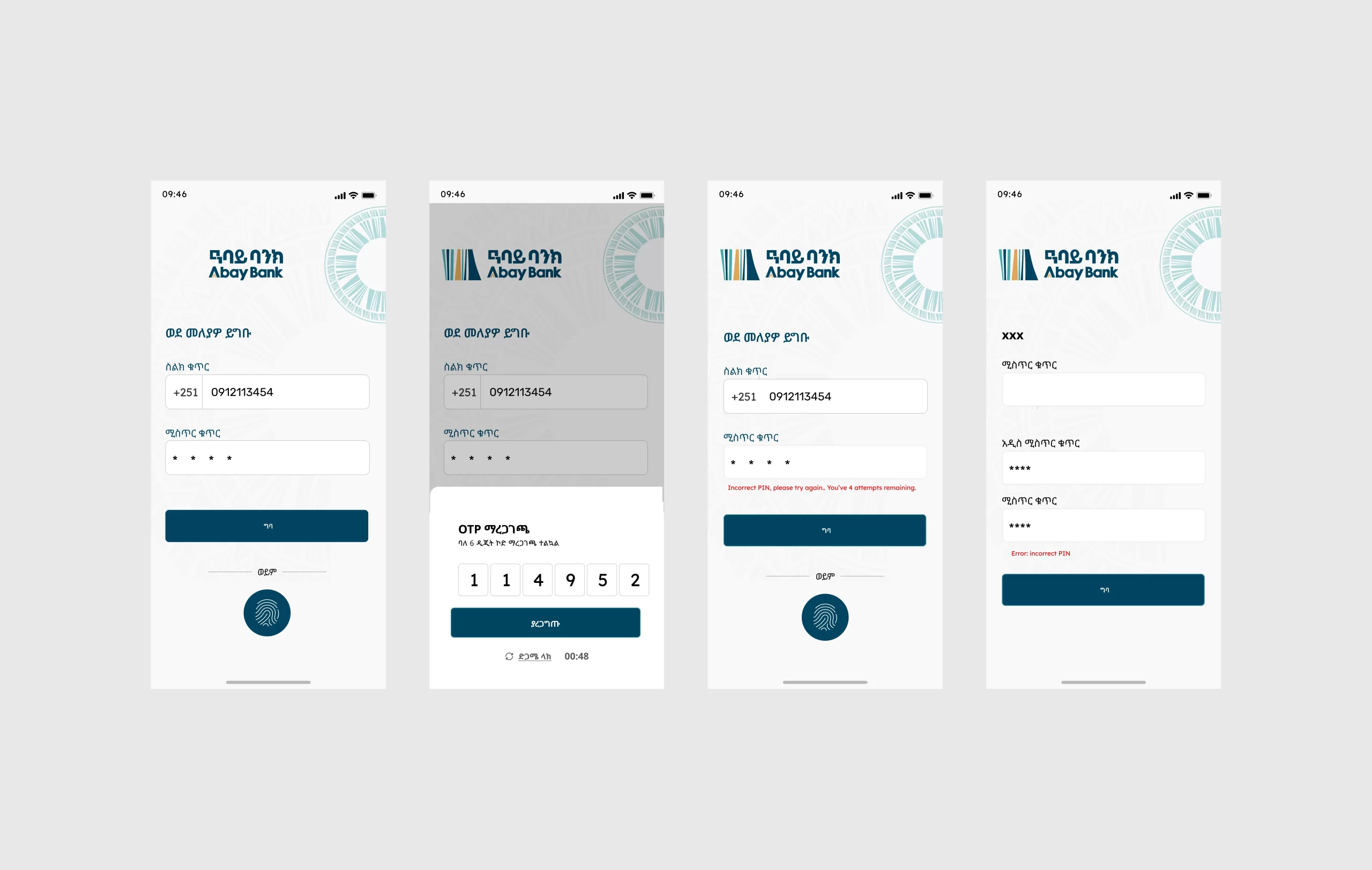 We designed the entire user interface based on Abay Bank’s new brand guidelines. This included standardizing font sizes, creating a logical flow for navigation (like moving the “Logout” button), and ensuring language consistency (Amharic & English) across all screens, confirmations, and error messages.
