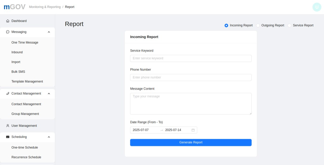 A robust, scalable National SMS Gateway and Application System was developed to support multilingual, two-way messaging. The platform enables administrators to send real-time updates and allows citizens to query public information using basic mobile phones—ensuring wide coverage and inclusivity.