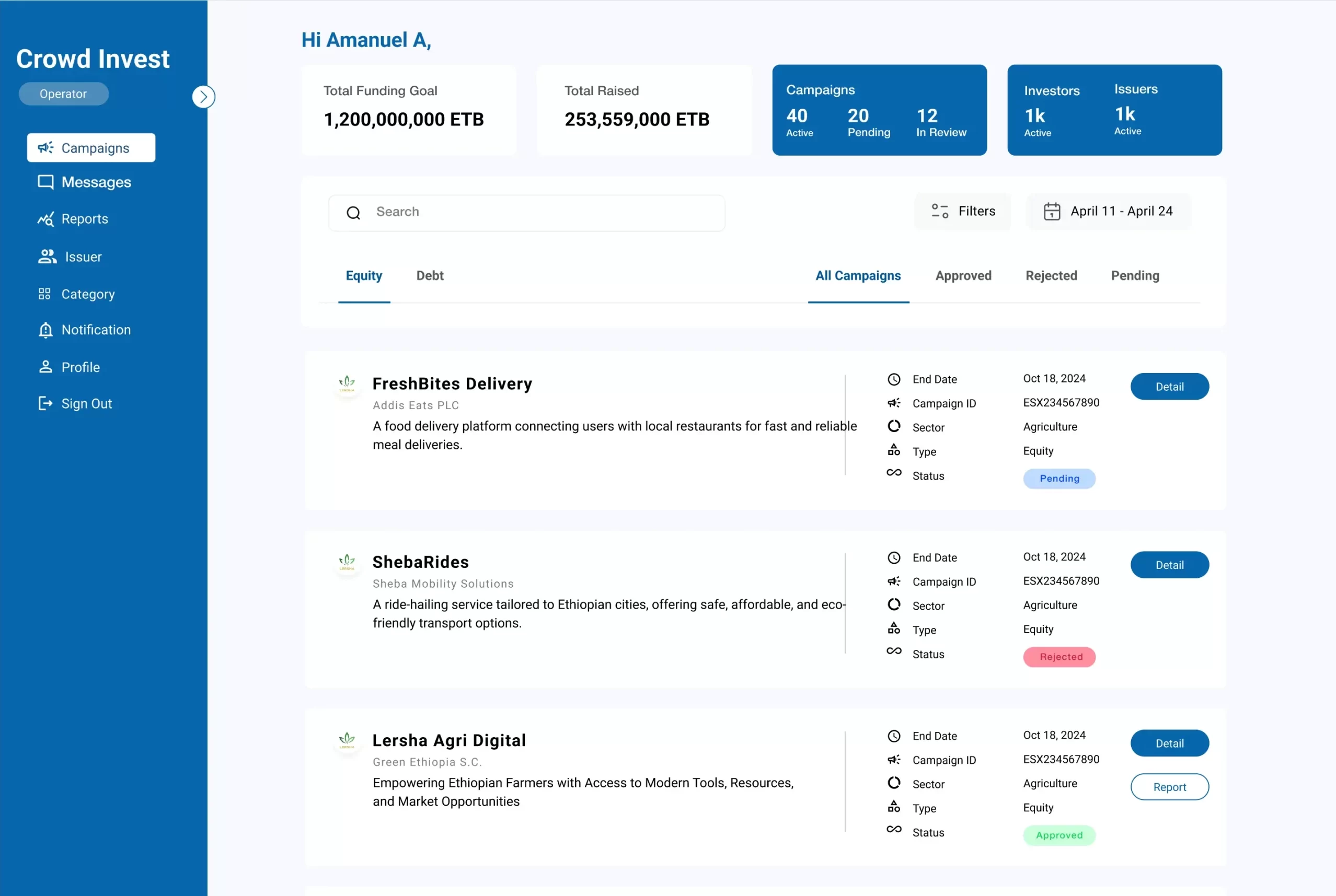 To bridge the critical funding gap for Ethiopia’s SMEs and startups by creating the nation’s first regulated, secure, and accessible crowd investment platform